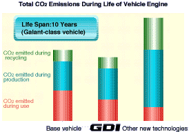 Some technologies, while enabling major CO2 emission reductions during combustion, involve higher-than-usual output during production or recycling, resulting in an increase in total emissions over the life of the vehicle. Because the GDI engine doesn't necessitate major alterations to existing production processes, production stage CO2 emissions are fundamentally the same as for conventional petrol engines. Moreover, with the GDI engine, CO2 emissions at the recycling stage are on a par with those of conventional petrol engines. Any reduction in on-road fuel requirements will thus translate directly into a reduction in total CO2 output.