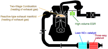 These new technical features include: Two-Stage Combustion, a feature made possible by the GDI's precise control over the formation of the air/fuel mixture, a reactive-type exhaust manifold, which maximises this effect and; exhaust gas recirculation (EGR), which takes advantage of the engine's highly stable combustion; and a revamped Lean NOx catalyst.