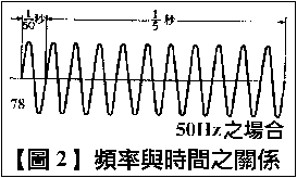 一般家庭用交流電源之頻率為60(50)Hz。一個周期之時間為1/60(1/50)秒,如圖2所示。是故在經過10個周期之時間後,在50Hz的場合為1/5秒,而60Hz的場合為1/6秒。