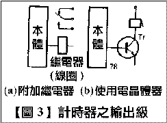 若係用來作時間之報知用時,則計時器之輸出係動作蜂鳴器或指示燈等。此時,可以利用圖3(a)之繼電器接點或採用(b)圖所示,以電晶體或閘流體予以控制。 |