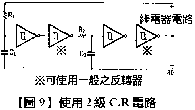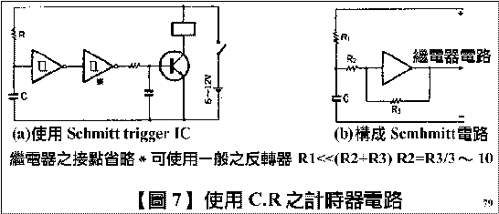 利用C.R之充電或放電時間之計時器,由僅使用一次充電或放電過程中所產生之時間,故必須使用大容量之C與高電阻之R。然後依C.R電路中之變化電壓令Gate IC動作,再由Gate IC之輸出控制電晶體或閘流體之開關動作。
