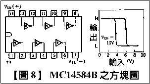 綜合以所述,可得圖7所示之電路。關於Schmitt trigger電路,雖亦可使用單一輸入端之Gate IC組成,本例中則使用Schmitt trigger專用之積體電路MC 14584B。 圖8左側為其接腳之連接方式,在一只IC中已藏6個獨立之電路。其特性則如同圖之右側所示。在使用10V電源的場合,反轉之輸入電壓分別為5.9V與3.9V。 |
