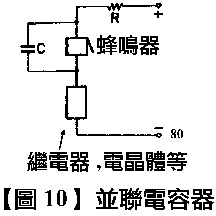 輸出側之繼電器與電晶體電路可參照前節教材。若係用迷你型蜂鳴器,則可串聯一只電阻器,並在蜂鳴器兩端連接一只10μF以上之電容器(其原因將在以後說明)。