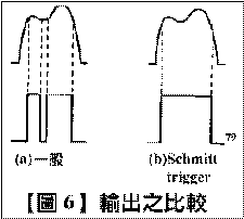 另外,假設輸入電壓波形如圖6之上側所示時,在用一般IC的場合,輸出波形將如左下角所示,輸出2個脈衝,若使用Schmitt trigger IC,則如右下側所示,可正確地輸出一只脈衝。