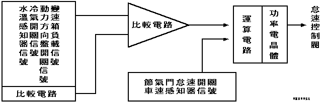 怠速狀態信號,是指節汽門怠速開關的信號,當節汽門全開關時,怠速開關接點與搭鐵導通,引擎電腦即可獲得 Lo(無電壓)信號,以辨認節汽門已在怠速位置,再配合修正補償之需求信號,供邏輯運算電路驅動控制電路。