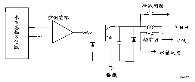 一般車輛的水箱風扇繼電器,是直接由引擎水溫開關控制,當引擎溫度到達設定溫度點後,該開關即會導通,使水箱風扇繼電器動作,以便轉送電瓶電源給水箱風扇使用。然而,對於噴射引擎系統而言,有些車種(如 Volvo 960),則依據水溫感知器的信號,由引擎電腦判斷水溫的溫度,再依溫度設定標準,予以控制水箱風扇繼電器。換言之,控制水箱風扇繼電器的電路,是由水溫感知器的信號,經邏輯電路偵測轉換後,再接到電晶體的 B 極(基極),以控制C極 (集極) ── 水箱風扇繼電器線圈,和 E 極(射極)搭鐵的導通迴路,猶如水溫開關方式,只是運用電晶體電路控制,而驅動水箱風扇繼電器的目的相同。此外,冷氣開關 ON後,冷氣壓縮機離合器動作,而水箱風扇繼電器,亦配合輸入的冷氣動作信號,直接驅動電晶體作用。