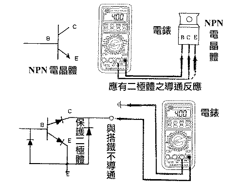 引擎電腦使用的電晶體,大都採用NPN電晶體,就二極體的PN接面而言,NPN電晶體的B極(基極)為P端,C極和E極為N端,利PN接面的特性,使用三用電錶以測量二極體的方法,即能分辨電晶體的功能。換言之,P 為正端(+)端,N 為負(-)端,以三用電錶測量B極和C極或E極,均會有導通狀態;反之,測量C極和E極之間,則單向不導通。