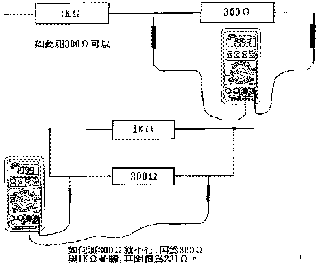 4. 另外在量電阻時,手不要碰到電阻的導線,因為人體有接近KΩ級的阻抗(隨著空氣濕度及面積有關),如果用手去接觸測棒導體,再去量電阻就會有負載效應,量出的會比實際的低。而在電路上的電阻亦是一樣道理,故不管測量什麼元件,只要電表放在電阻檔位去測量,其被測元件就必須完全隔離,不能有電壓的成份也不可以與其它元件並聯,如下 :