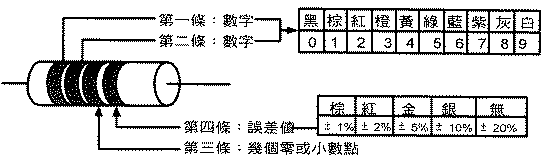 一般只有二種色碼: 金色為誤差5% 銀色為10% 無色為20% 而數字碼及倍數碼有下列顏色: 黑:0 棕:1 紅:2 橙:3 灰:8 白:9 黃:4 綠:5 藍:6 紫:7 |