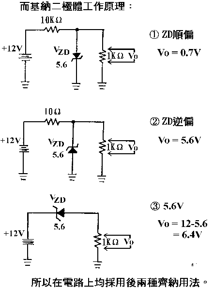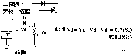二極體為一種半導體材料所製成的元件,在一般常溫是不導通的,在某一條件下,才可以有條件導通,如二極體中的材料為三價位元及五價位元組合,其結合面稱為PN接面有其障位電壓為0.7V(矽材料)或0.3V(鍺材料),這時若要使二極體導通就必須符合(1)電壓接法為順偏(基納例外),(2)電壓必須超過障位電壓(即所謂的切入電壓)這時二極體才可以工作,由於導通時其輸入Vin並不等於輸出Vo所以才稱有條件的導通(在往後的電晶體就更明顯)。而齊納二極體是工作於崩潰區,所以有二種特性:(1)電壓順偏為普通二極體,(2)逆偏時超過某值就導通,具有穩壓作用,故齊納二極體均工作於逆偏狀態下。符號: