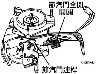 在 Wrangler (藍哥) 吉普車上, 設計有 WOT (Wide Open Throttle Switch) 節汽門全開開關, 其調整方法如下: 1. 將節汽門拉到全開位置。 2. 轉動調整螺絲,將節汽門刻度,調整到全開前12度的位置。 3. 調整後,檢查節汽門的開度,在此12度位置時,應有 "喀搭"聲,表示開關作用。 4. 若無刻度規可供調整,可使用圓規尺,檢查節汽門全開前12度的作用點。