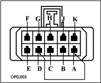 ■當MID偵測到旅程電腦有故障時,會再右下角時間顯示區前方出現"F"字樣 ,將 10pin診斷座中 D腳跨接 A腳即會顯示故障碼在時間顯示區。 ◎MID故障碼對照表: OPEL ─ 10腳診斷座
