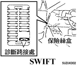 一、引擎故障碼讀取與清除: ◎適用車種 ─ 電腦控制引擎全車系 ◎故障顯示 ─ 由儀錶板的『CHECK ENGINE』燈顯示 (一).讀取與清除程序: 第一類: 1.先找出診斷座位置。 2.診斷座位於儀錶板左下方的保險絲盒內,而在保險絲座左下方有一空的保險絲孔。 3.把保險絲裝在這個空的孔內,再把點火開關KEY-ON ,但不發動引擎, 儀錶板CHECK ENGINE就會開始閃爍。