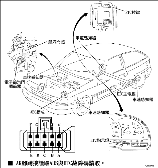 (四).防滑剎車系統故障碼讀取與清除 ─ OPEL 歐寶車系採用的ABS防滑剎車系統有兩種型: ◎一種為單純的ABS系統。(ABS) ◎另一種為巡蹤式ABS系統。(ABS + ETC) 故障碼讀取均由診斷座中A、K腳跨接後由 ABS警示燈或 ETC警示燈來閃爍出故障碼。